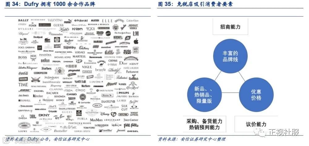 ■规模、渠道及供应链:中免全方位领先,其他参与者积极拓展。1)规模:目前中国中免规模最大(国际前四),与品牌议价能力最强,且拟并表海免、新增免税店,规模持续提升,预计今年称霸全球。国内其次是深免、珠免和海免(已被中免收购)(18年销售额各占比约5%);中出服及其他免税商体量较小;王府井6月刚获免税牌照但百货业态已在全国33个城市布局,远期发力市内免税潜力大。2)渠道:线下渠道看,机场、口岸是目前免税消费主要渠道,市内渠道为待掘金矿,有望与机场渠道相辅相成;线上渠道疫情期间得到助推。中免线下渠道涵盖9大类型,线上业务在疫情下得到催化,公司口径疫情期间上线以来线上销售额已经占比50%,公司未来将继续整合中免、日上、海免的会员体系,发力电商渠道,目标电商渠道销售额占比30%+;王府井近年来持续推进线上线下一体化建设,奠定未来免税业务线上渠道销售基础;珠海免税线下主要是口岸免税店,线上尝试珠海免税APP,但目前只能线上预购,门店提货。3)供应链:免税为买断的商业模式,稳定、优质的供应链决定了免税商品吸引力,同时强大的采购规模与毛利率及价格优势高度相关:2006年-2015年,全球免税巨头Dufry持续进行收购并购,期间毛利率持续提升10pct+;韩国免税巨头乐天与国内外2万多个品牌进行合作,价格优势明显。目前中免拥有1000+品牌供应商,并拥有经验丰富的买手团队和5个配送中心,且在疫情期间消费加速回流背景下,中免有望进一步拉近与品牌方合作关系,构筑高供应链壁垒;王府井百货业态下招商团队经验丰富,品牌方优势+销售渠道有望带来协同;珠海免税直采+中间商采购相结合,合作品牌集中于烟酒品类,与多家知名烟酒品牌建立合作关系;中出服有37年免税经营历史奠定免税品供应商基础及免税经营能力,与全球300+供应商深度合作。