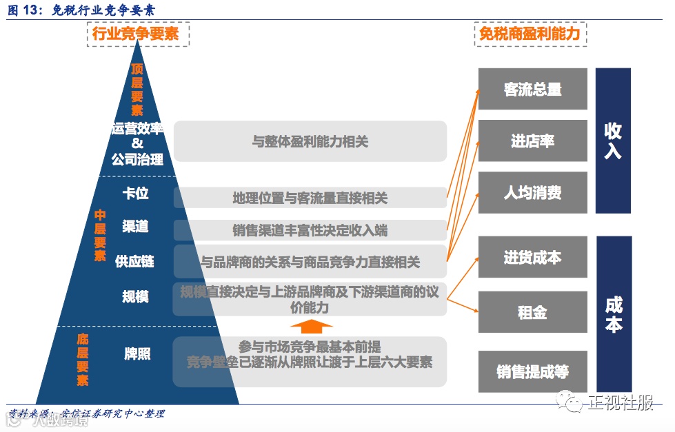 免税牌照是参与市场竞争的最底层要素,行业早期竞争壁垒主要在于免税牌照,随着行业政 策不断放宽,竞争主线已逐渐从底层牌照竞争逐步转向中层竞争要素—规模、供应链、渠道 和卡位的竞争: