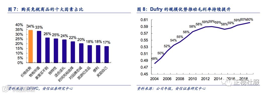 规模优势带来的价格优势才是消费回流核心驱动力。免税商品竞争的核心优势之一在于价格,根据DFWC(免税世界理事会)2018Q4的KPI监测,价格优势是消费者选购免税商品的首要因素。而免税商规模直接影响到免税商的价格优势:具备规模优势的免税商在和上游品牌商以价是具备更多话语权,能以较低的价格采购商品;同时大的免税商在和机场等渠道商谈判时也能争取到更多优惠。2006年-2015年,全球免税巨头Dufry持续进行收购并购,先后收购加勒比地区旅游零售商、Hudson集团、以及阿根廷、乌拉圭、厄瓜多尔等多地零售商,规模不断扩大。随着规模优势的建立,公司对上游品牌商议价能力也在不断提高,2014-2018年毛利率持续提升10pct+。因此,必须要有足够体量和规模的免税商存在,才能够达到国家对于消费回流的目标。