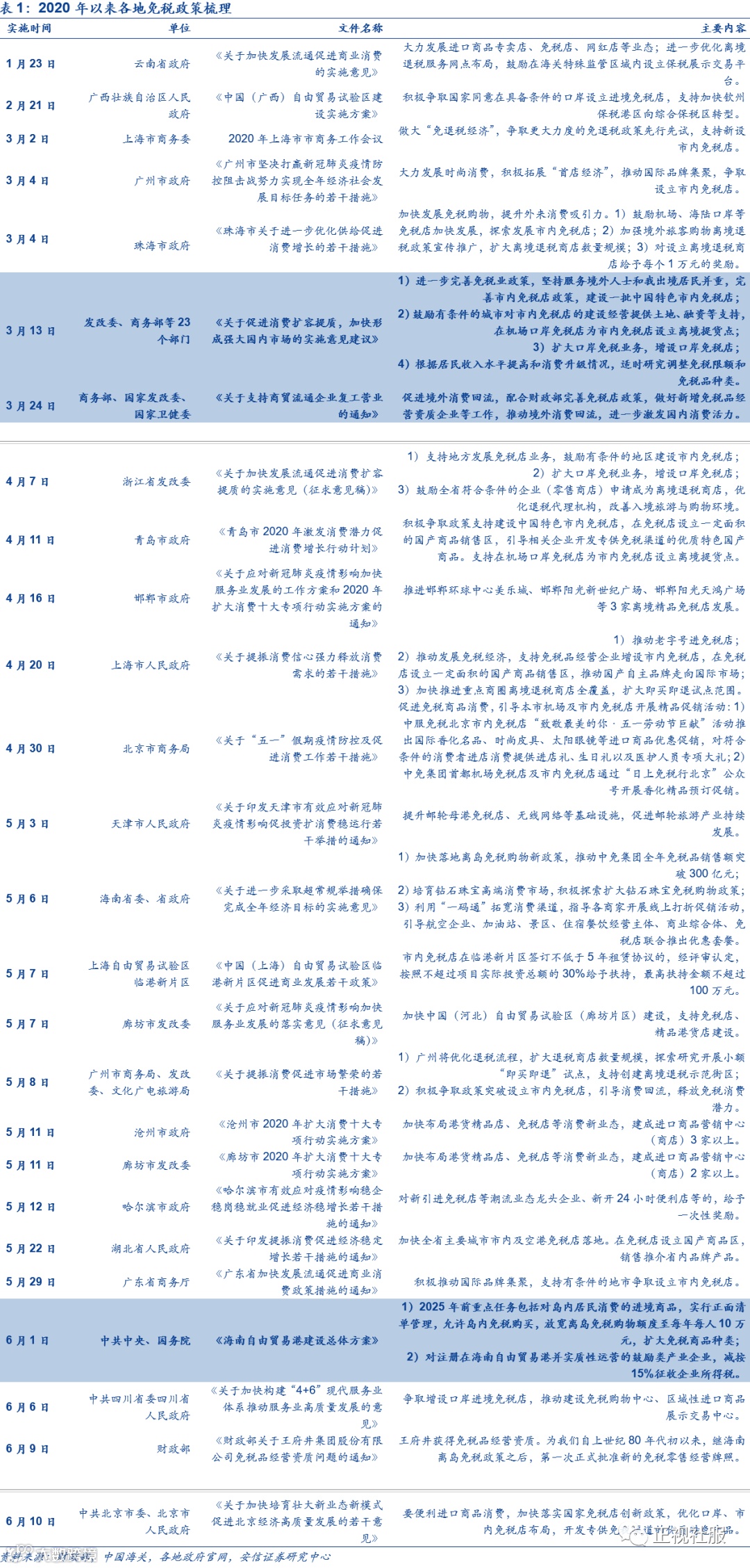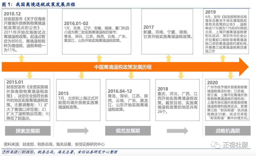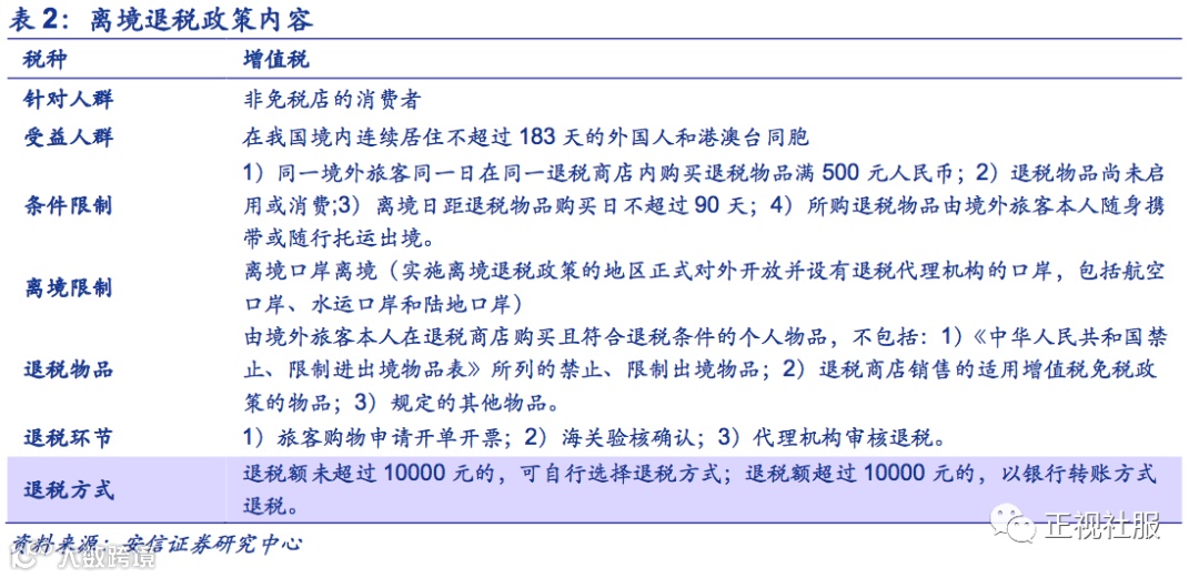 此外,国家还持续推动离境退税政策,吸引境外购物人群。2020年6月16日,浙江省商务 厅公布浙江省第一批离境退税商店名单,离境退税税种主要为增值税,是针对非免税店的消 费退税;受益人群方面,主要针对在我国境内连续居住不超过183天的外国人和港澳台同胞;离境限制方面,主要针对在离境口岸离境,即实施离境退税政策的地区正式对外开放并设有 退税代理机构的口岸,包括航空口岸、水运口岸和陆地口岸。我国从 2010 年开始推进境外 游客离境退税政策试点,随后在 2015-2018 年逐步扩大覆盖范围,2019 年以来迎来战略机 遇期。通过离境退税政策的放宽,意在吸引更多境外人群的消费。