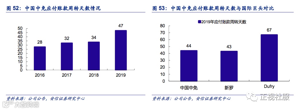 中国中免的营运能力与国际水平比肩。中国中免整体运营效率较高,与国际免税巨头水平比肩。从2019年情况看,中免存货周转天数104天,高于新罗,低于Dufry;公司应付账款周转天数也在逐年提升,2019年高于新罗,略低于Dufry,展现出公司国际一流的营运能力和效率。