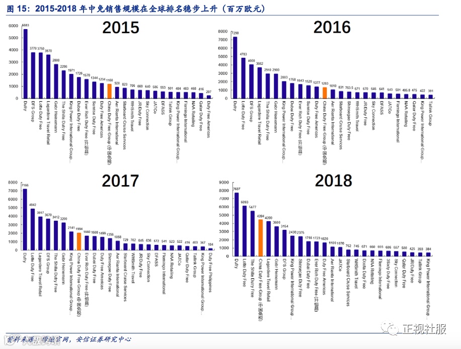 公司是国内最大的免税运营商,旗下拥有240多家免税店,根据股东大会公开交流,目前国 内市占率已经提升到 80%以上,处于绝对优势地位。同时在国际上排名持续提升,根据 Moodie Davitt Report,2015年至今,中国国旅营收规模稳步上升,排名从2015年的第12 位升至2018年的第4位,2018年中免集团销售额43.94亿欧元,为全球第四大免税零售商, 市占率 6.75%,前 1-3 名分别为美国 Dufry(11.8%,为 2018 年市占率数字,下同)、韩国 乐天(9.37%)和韩国新罗(8.42%)。