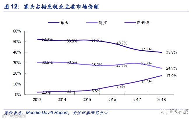 寡头市场地位稳固,牌照限制政策出台后市占率仍超80%。为维护交易公平政策,韩国免税业出台反垄断措施,2012年宣布不再向大型免税店发放新的牌照并且同时发放10张中小企业牌照使得市场竞争更加激烈,但实际上对于市场份额的影响较小,2013年以后,乐天仍占据50%的市场份额,新罗市占率在30%上下浮动,仍呈现寡头垄断态势。2017-2018年乐天份额下跌主要由于退出仁川机场T1业务交接影响,并非受到免税牌照影响。中小企业由于进入免税业时间较晚,企业规模较小,虽受到政策扶持,但无论知名度、基础设施建设以及与品牌合作方面都处于劣势,短期内难以撼动寡头地位。另一新生力量新世界由于2015年打败华克山庄获得新的牌照,2018年接下乐天在仁川机场T1的两个柜台跻身寡头行列,乐天与新罗市占率虽有所降低,但头部三个免税商的占比稳定在80%以上,寡头垄断格局仍未遭到破坏。