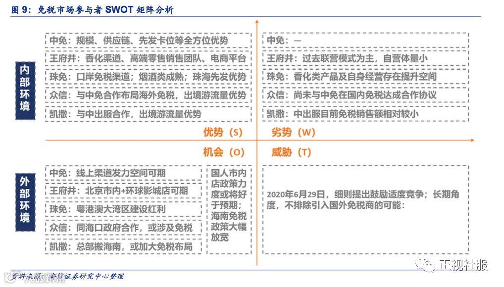 ■随着行业政策不断放宽,竞争主线由牌照向上层要素转移。目前中免全方位领先,王府井优势在于北京核心地段&环球影城和首旅集团资源支持,珠免优势在于烟酒品类以及珠海优质卡位,众信和凯撒则在于出境游客流资源赋能。免税商的规模与议价能力直接相关,规模越大,与上游品牌商和下游渠道商的议价能力越强,有助于降低成本和租金;与上游品牌合作商的关系及自身采购选品能力决定了商品竞争力;渠道的多样性则有助于客流提升;此外,优质卡位有限,先进入者可以占据优质地理位置,保证门店客流;管理层背景及公司运营效率也从顶层决定公司整体盈利能力。因此,随着行业政策不断放宽,竞争主线将逐渐从底层牌照竞争逐步转向上层竞争要素—规模、供应链&采购、卡位、经营效率和公司治理等多维度竞争,我们运用SWOT矩阵深入分析行业参与者竞争优势。