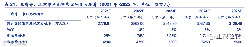 考虑到市内免税2019年占国内免税销售比例仅1%,相比全球及韩国均处于较低水平,且北京机场免税店2019年已实现营收85.89亿元,未来公司的市内免税店潜力可期。根据阳光海南网数据,海南省离岛免税的购物客流在整体游客中2018-19年占比约为13%和17%;我们保守假设在未来3-5年下,预计北京出入境客流的市内免税购物渗透率在2021~2025年市内免税购物转化率为1.25%/1.75%/2.25%/2.75%/3.00%;客单价分别4500元/4750元/5000元/5250元/5500元假设下,对应王府井市内免税业务2021-2025年营收分别为15.64亿元/23.80亿元/33.17亿元/43.85亿元/51.62亿元,对应净利润为2.46亿元/4.25亿元/6.21亿元/8.57亿元/10.50亿元,对应销售净利率15.75%/17.87%/18.72%/19.54%/20.34%。
