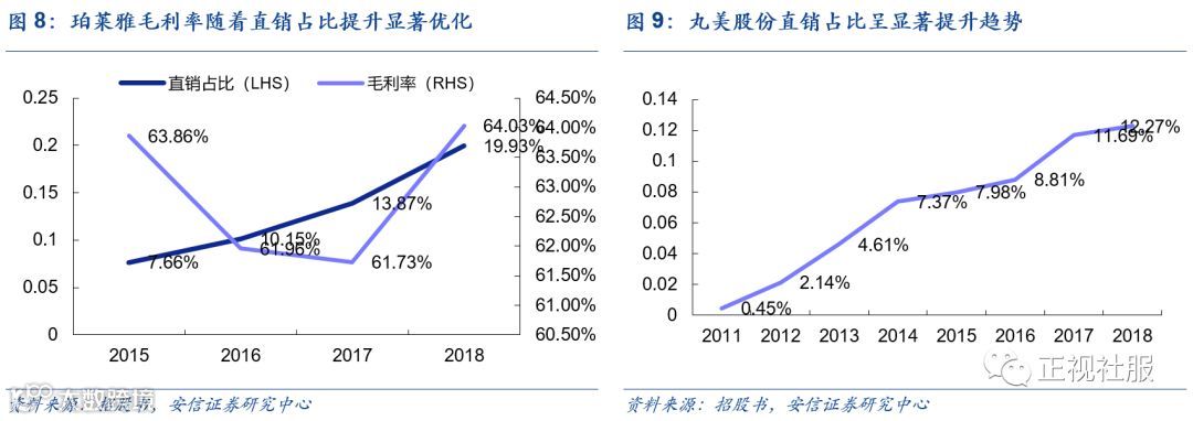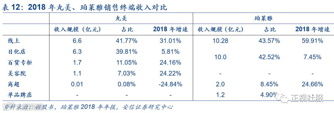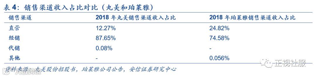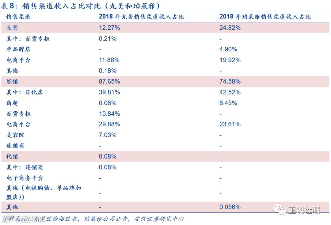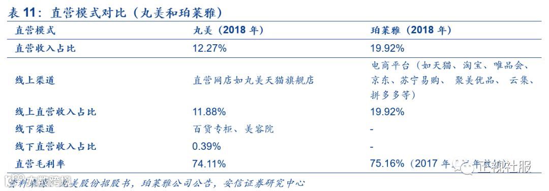 2018年丸美股份的直营收入占比为12%,珀莱雅直营占比约为25%,丸美股份直营占比远低于珀莱雅。