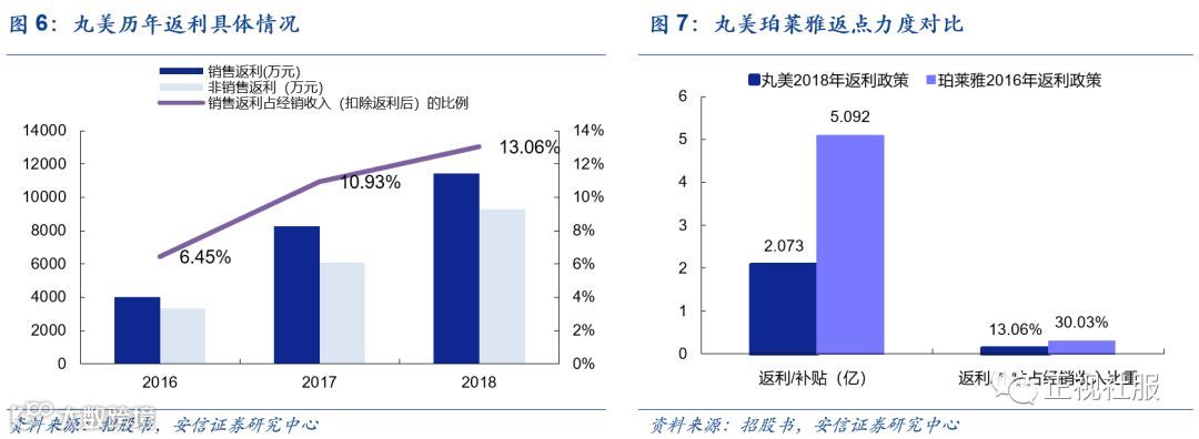 因素二:低返利。丸美股份返利力度远低于珀莱雅。丸美的返利均为货物返利,只发放予与发行人直接进行交易的经销商,返利的计提和发放方式与珀莱雅等其他消费类企业市公司基本一致。2016-2018年丸美股份销售返利占经销收入(扣除返利前)比例逐年提升,2018年返利占经销收入约13.06%,但仍远低于珀莱雅2016年返利力度(返利约占经销收入30%)。