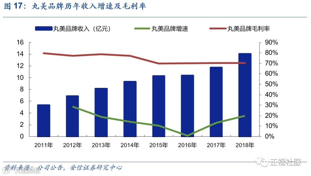 丸美品牌专注眼部护理,定位中高端市场,价格约在118元-828元之间。2018年贡献89%收入,92%毛利润,毛利率水平维持在70%以上,收入保持稳定增长,具有较高的市场认可度。
