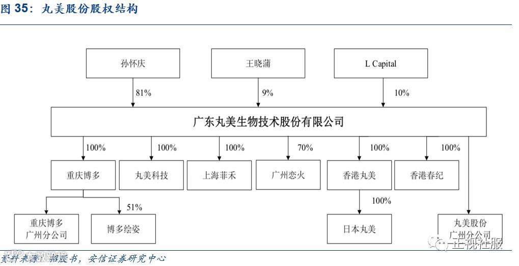 丸美股份上市前由孙怀庆(占股81%)和王晓蒲(占股9%)夫妇实际控制,L Capital(占股10%)为第三大股东。广州佳禾(丸美股份前身)在2002年4月由广州升旺、日本史威共同出资设立;在2012年2月整体变更设立股份有限公司,并更名为丸美股份;2013年L Capital入股丸美,企业变更为中外合资。截至2019年6月,公司拥有6家全资子公司:重庆博多、丸美科技、上海菲禾、香港丸美、香港春纪、丸美科技(广州);1家控股子公司:广州恋火;1家二级子公司:日本丸美(为香港丸美全资控股)。