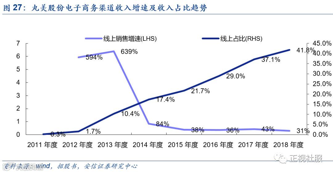 丸美股份渠道以经销为主、直营和代销为辅。线下覆盖日化店、百货专柜、美容院、商超等多渠道,线上覆盖淘宝、天猫、贝贝、美丽说、唯品会、京东、聚美优品等电商平台。2018年直营占收入比例约12%,经销占比约88%,代销占比不足0.1%。