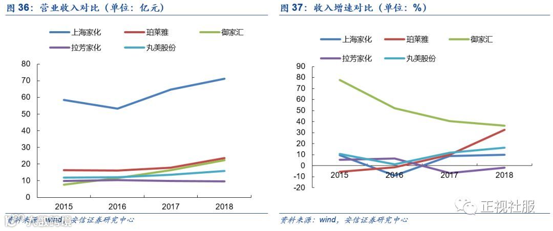 ■我们认为丸美股份有较强的持续增长潜力及横向延伸张力。①公司上市筹备历经5年,或影响收入增长,上市后增速有望大幅提升;以珀莱雅为例,上市前由于渠道调整影响收入增长,15年曾陷入负增长,16/17年持续增长缓慢,但上市后即放量高增。②丸美股份盈利能力远高于行业水平:毛利率约在68%(同行业可比上市公司均在50%-65%),净利率约26%,净资产收益率为35.57%(同行业可比上市公司均在2%-19%),高盈利能力主要源于三个因素:高定价、低返利、折扣力度小,凸显品牌溢价,展现未来较大扩张潜力。③直销占比低,有望通过提升直销占比大幅优化盈利能力:2018年丸美股份的直营收入占比为12%,珀莱雅直营占比约为25%,丸美股份直营占比远低于珀莱雅。④主品牌卡位化妆品最优细分赛道之一眼部护理,定位中高端,保障公司核心盈利能力,促使公司品牌及品类扩张具有更强张力。