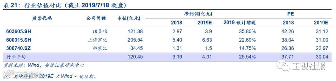 ■投资建议:主品牌稳步增长,发力彩妆多品类扩张,具有较强持续增长潜力及横向延伸张力:未来有望通过多品牌、多品类的发展战略,打造多元化、受众广的多品牌发展体系;进一步拓展和完善全国的营销网络,完善信息化网络平台的建设,全面导入研发、生产、营销信息化系统。预计丸美股份2019-2021年收入分别为19.39/23.91/29.51亿元,对应增速为23.19%/23.29%/23.42%;归母净利润分别为5.02/6.05/7.31亿元,对应增速为20.95%/20.50%/20.69%。假设按照上限发行4100万股,总股本为4.01亿股,对应2019-2021年EPS为1.25/1.51/1.82元。对比行业可比公司平均水平,考虑公司较强的增长及扩张能力,我们认为丸美股份合理估值中枢为2019年29xPE,取估值区间27-31xPE,对应33.75-38.75元/股。