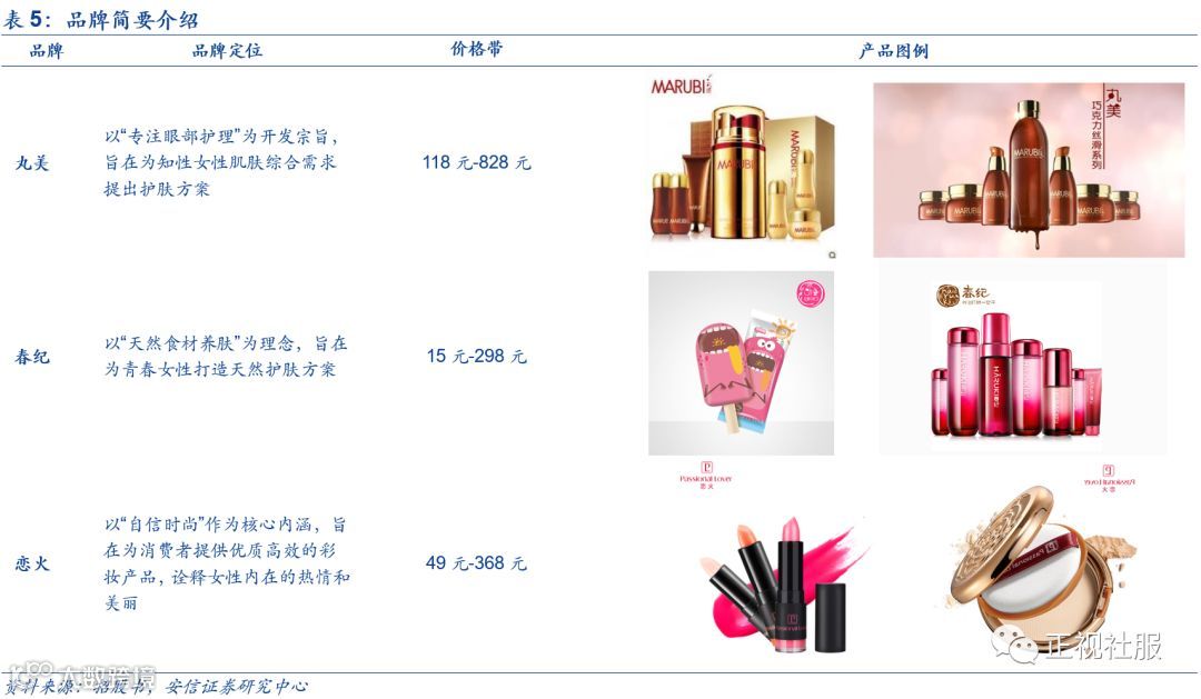 春纪定位大众市场,价格大约15元-298元之间,贡献约9%营收,6%毛利润。旗下拥有“杨梅水漾保湿系列”、“弹力娇嫩系列”、“黑白摩登美白系列”等系列产品。公司产品品牌的差异化定位覆盖了不同年龄段、消费水平的客户群。