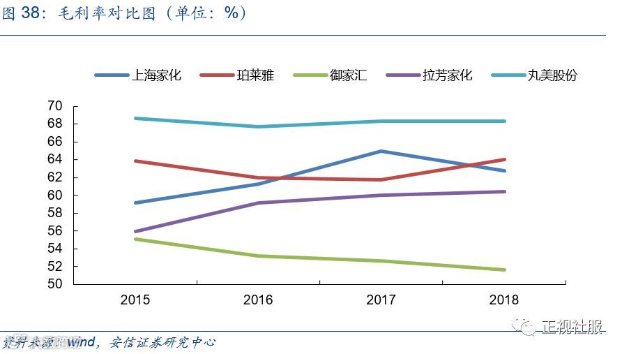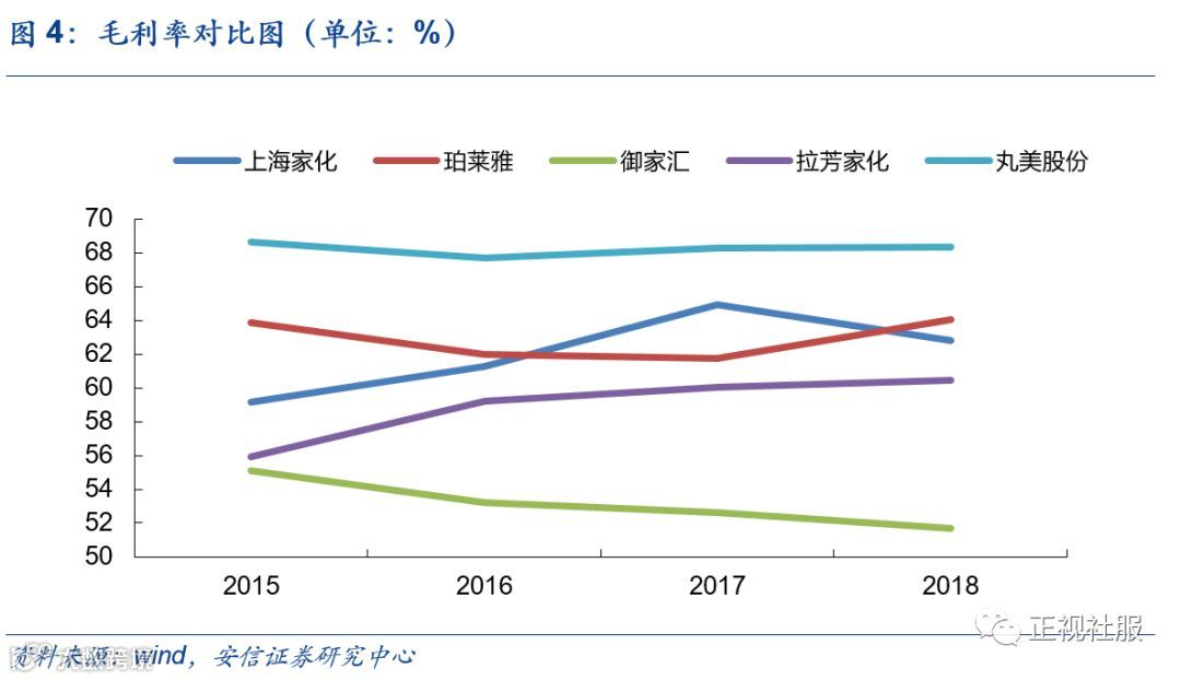 毛利率远高于行业水平。丸美股份的综合毛利率在68%左右,同行业可比上市公司——上海家化、珀莱雅、御家汇、拉芳家化均在50%-65%之间。丸美股份的毛利率高于同行业上市公司。