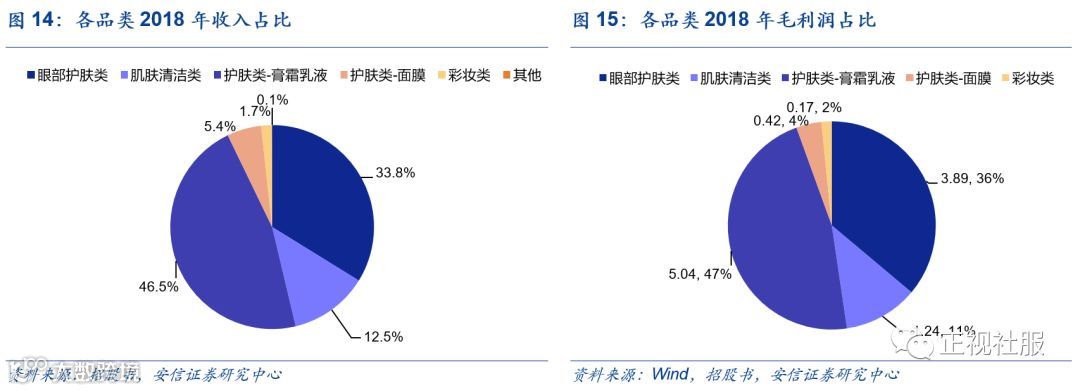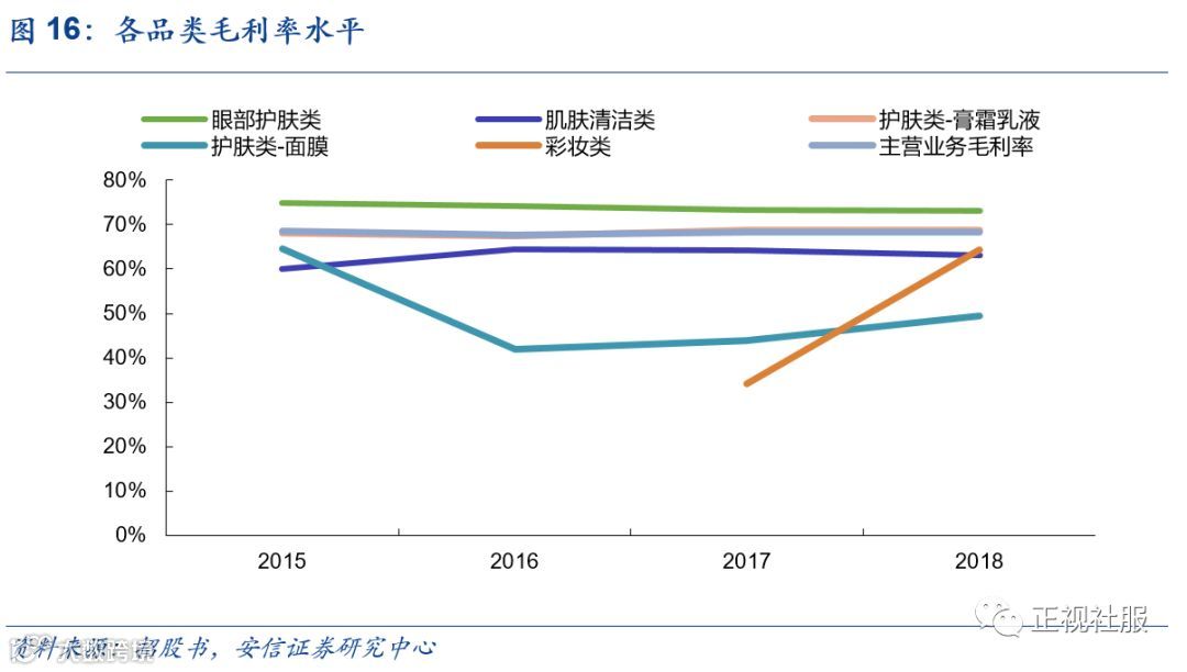 分品类来看,2018年护肤类(膏霜乳液)收入占比47%、毛利占比47%,眼部护肤类收入占比34%、毛利占比36%,肌肤清洁类收入占比13%、毛利占比11%,护肤类(面膜)收入占比5.4%、毛利占比4%,彩妆类收入占比约2%、毛利占比2%。其中眼部护肤类作为公司优势品类,毛利率远高于其他品类。