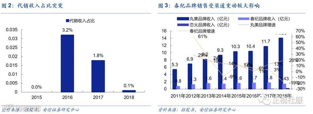 丸美2018年的代销占比为不足0.1%,2017年占比1.8%,主要系丸美股份分别于 2017 年下半年和 2018 年上半年终止了与屈臣氏、大润发渠道的合作,因此导致代销收入大规模下降。