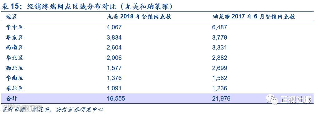 从终端销售网点分布来看,丸美股份与珀莱雅较为相似,经销商网点主要分布在华中区、华东区等,而东北区等区域经销商网点数量相对较少。