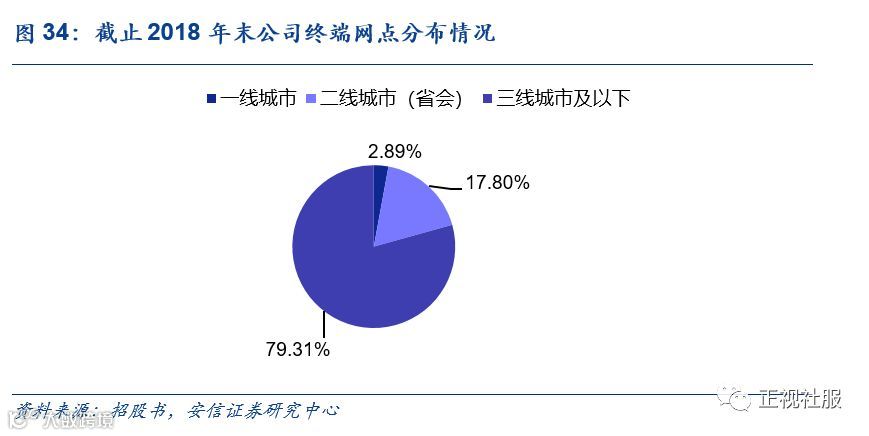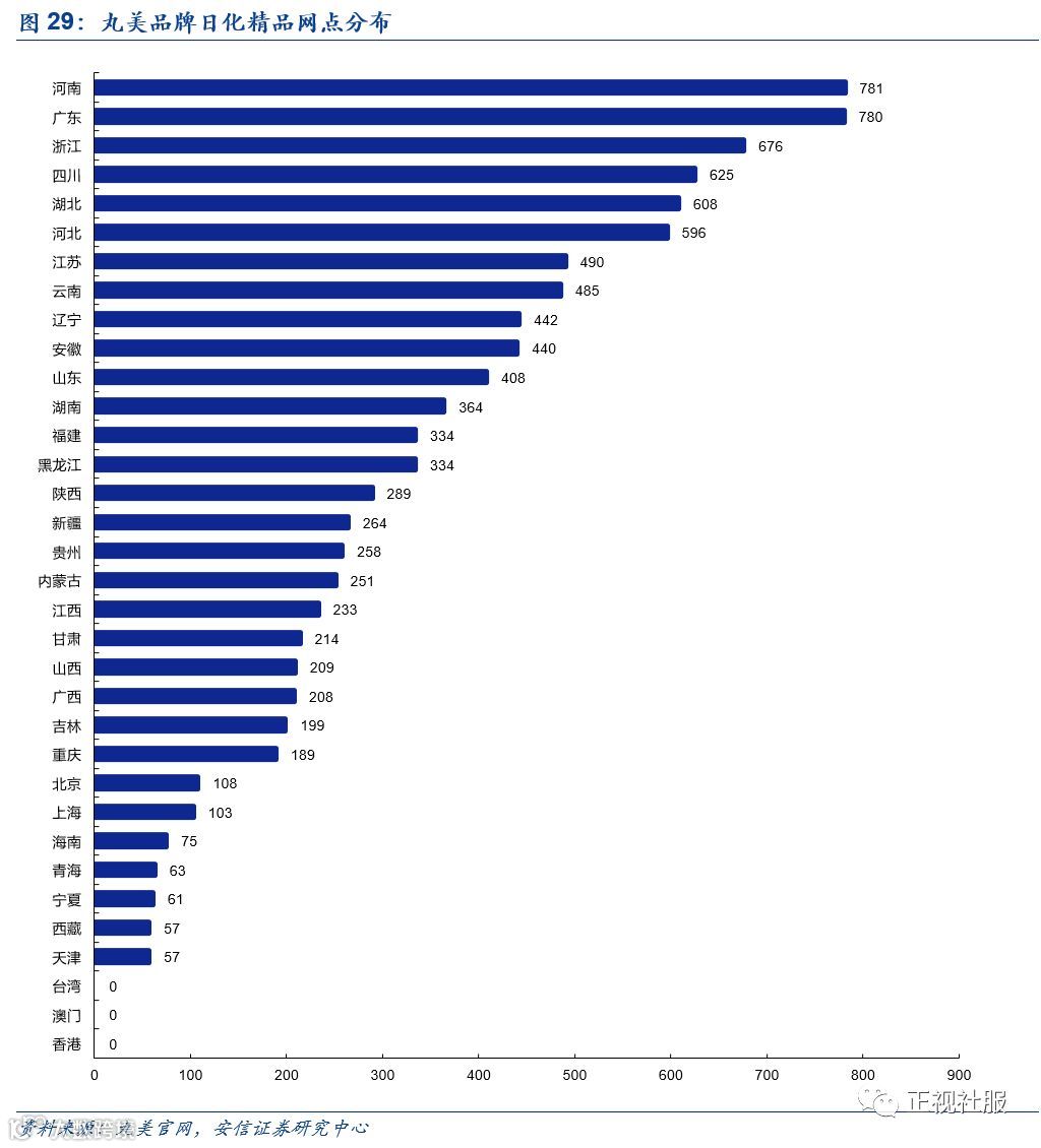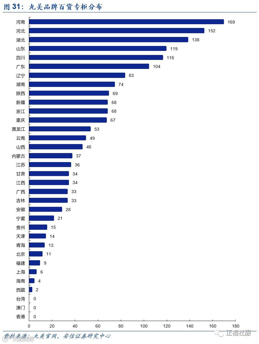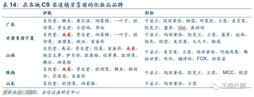 公司主打低线市场,经销网点实现了全国 31 个省、自治区和直辖市的全覆盖。截止2018年,经销商终端网点数量为16,555家,其中一线城市终端网点数量占比 2.89%,二线城市(省会城市)终端网点数量占比 17.80%,三线及三线以下城市终端网点数量占比 79.31%。根据CBO线下抽样调研,丸美品牌在陕西、山西、甘肃、青海、宁夏等区域CS渠道销量均为前列。