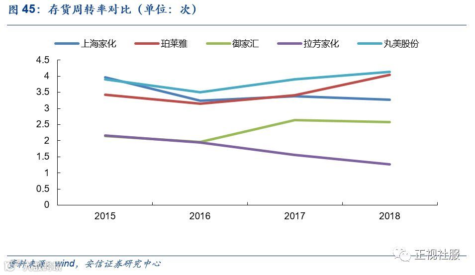 存货周转率处于较高水平。丸美股份的存货周转率在3.4-4.0之间,与可比公司——上海家化、珀莱雅、御家汇、拉芳家化相比,处于较高水平,其存货周转较快。