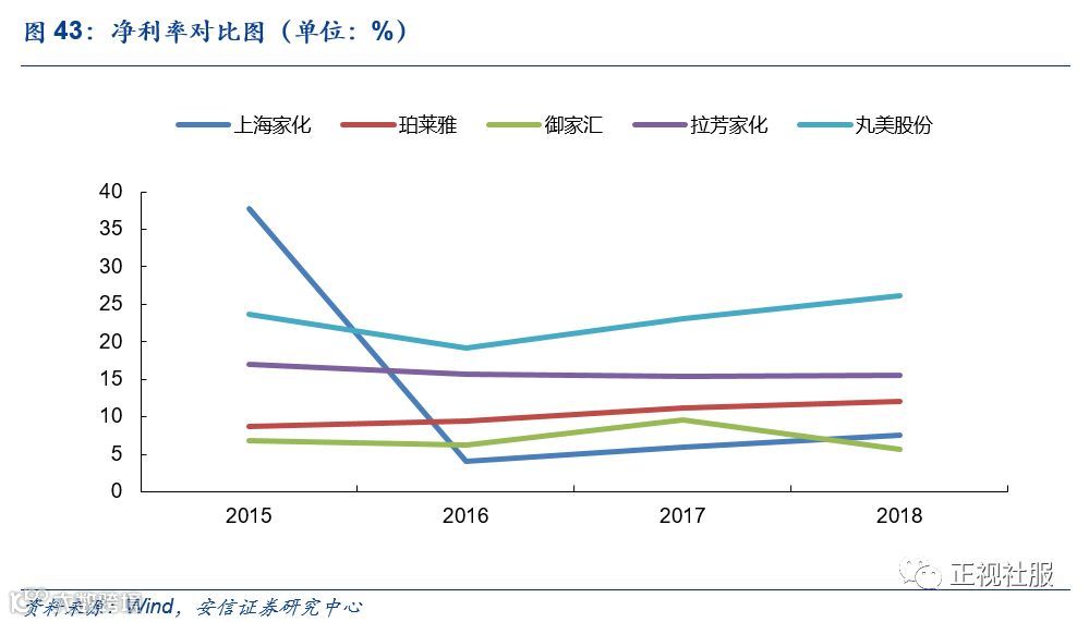 高毛利驱动净利率远高于同行。丸美股份2018的年净利率达到了26.15%,而其他可比公司均在16%以下。