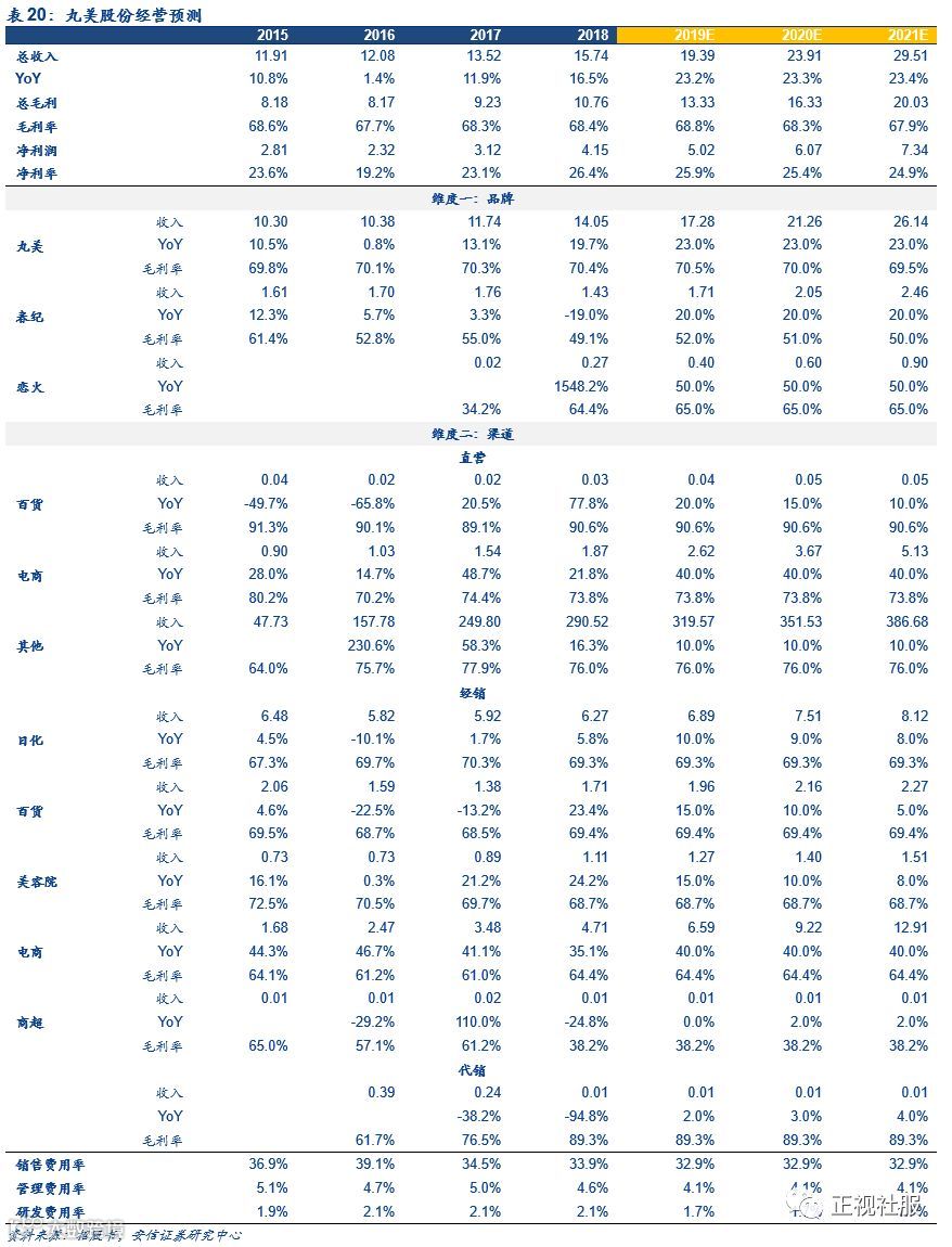 品牌维度:丸美品牌2019-2021年收入增速分别为23%/23%/23%,毛利率约为70.5%/70.0%/69.5%;春季品牌2019-2021年收入增速分别为20%/20%/20%,毛利率约为52%/51%/50%;恋火品牌2019-2021年收入增速分别为50%/50%/50%,毛利率约为65%/65%/65%。