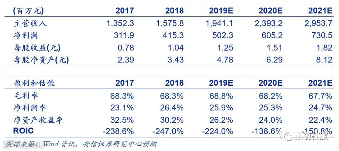 基于以上假设,预计丸美股份2019-2021年收入分别为19.39/23.91/29.51亿元,对应增速为23.19%/23.29%/23.42%;归母净利润分别为5.02/6.05/7.31亿元,对应增速为20.95%/20.50%/20.69%。假设按照上限发行4100万股,总股本为4.01亿股,对应2019-2021年EPS为1.25/1.51/1.82元。