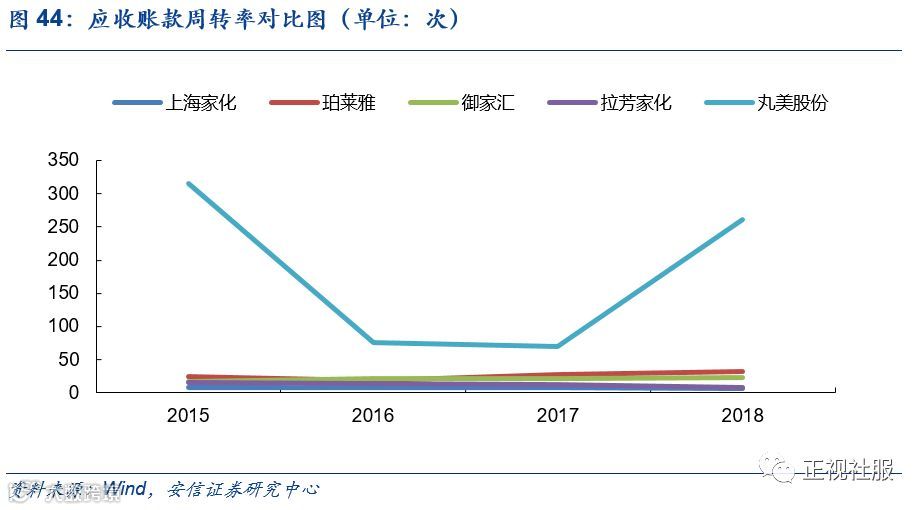 应收账款周转率远高于可比公司。同行业可比公司应收账款周转率均在50以下,丸美股份的应收账款周转率远高于其他几家公司,2018年达261.16。