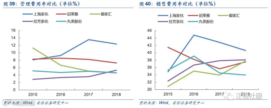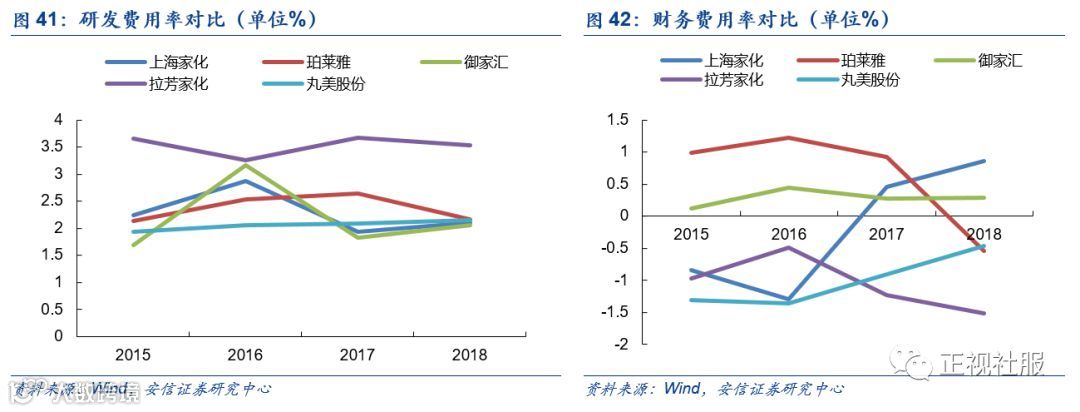 丸美股份的管理费用率与同行业可比公司相比处于较低水平,仅高于拉芳家化,低于其他几家公司。销售费用率为行业平均水平,研发费用率处于较低水平。