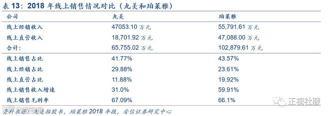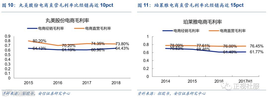 丸美股份电商直营毛利率比经销高近10pct,珀莱雅电商直营毛利率比经销高近15pct。