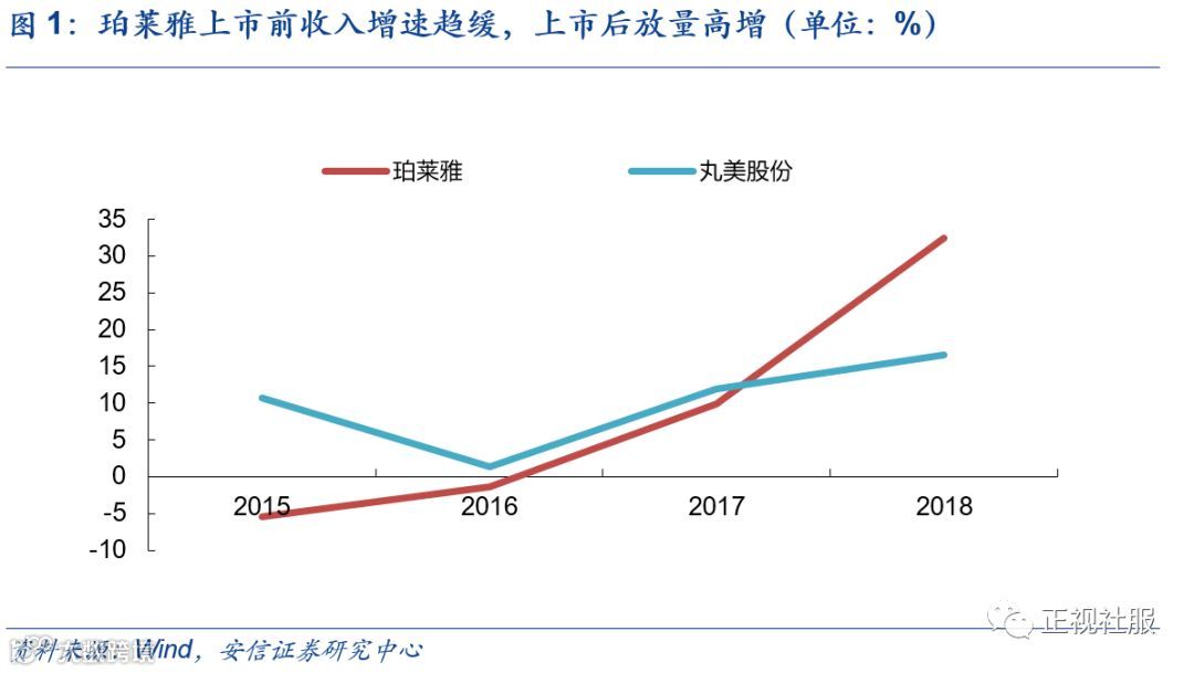 化妆品企业销售模式中,经销普遍占比较高,而经销收入的真实性是上市核查的重点。企业上市前,经销体系中难以避免会存在关联方等情况,在上市过程中需要清理或调整,即会影响到企业的自然增长。以珀莱雅为例,上市前由于渠道调整影响收入增长,15年曾陷入负增长,16/17年持续增长缓慢,但上市后即放量高增。