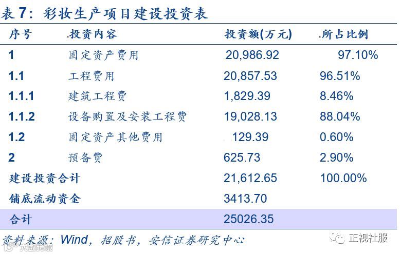 彩妆将为公司未来投入重点,上市募集资金用途中,31%的资金拟用于彩妆产品生产建设。丸美股份计划建设的彩妆生产基地,主要生产用于美化和改善皮肤功能的丸美彩妆产品,包括脸部彩妆、眼部彩妆、唇部彩妆等三大类,细分为卸妆膏、卸妆液/乳、口红、粉饼等四大类产品。该项目预计共需要厂房13,400.00 平方米,总投资额为 2.5亿元,其中建设投资合计2.1亿元,铺底流动资金3413.70万元。建设期为 2 年。该生产基地建成后,丸美股份将实现彩妆产品营业收入达 56000万元,年均净利润达11573.25万元,投资回收期预计4.11年。