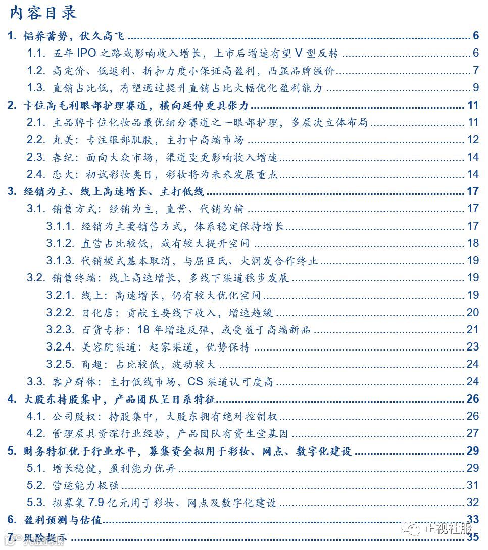 我们认为丸美股份有较强的持续增长潜力及横向延伸张力。①公司上市筹备历经5年,或影响收入增长,上市后增速有望大幅提升;以珀莱雅为例,上市前由于渠道调整影响收入增长,15年曾陷入负增长,16/17年持续增长缓慢,但上市后即放量高增。②丸美股份盈利能力远高于行业水平:毛利率约在68%(同行业可比上市公司均在50%-65%),净资产收益率为35.57%(同行业可比上市公司均在2%-19%),高盈利能力主要源于三个因素:高定价、低返利、折扣力度小,凸显品牌溢价,展现未来较大扩张潜力。③直销占比低,有望通过提升直销占比大幅优化盈利能力:2018年丸美股份的直营收入占比为12%,珀莱雅直营占比约为25%,丸美股份直营占比远低于珀莱雅。④主品牌卡位化妆品最优细分赛道之一眼部护理,定位中高端,保障公司核心盈利能力,促使公司品牌及品类扩张具有更强张力。