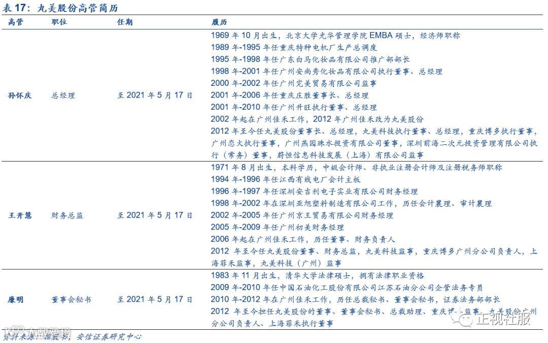 ■大股东持股集中,产品团队呈日系特征。丸美股份上市前由孙怀庆(占股81%)和王晓蒲(占股9%)夫妇实际控制,L Capital(占股10%)为第三大股东。丸美股份营销、产品、研发团队具有浓重的日系风格,多位总监原为资生堂资深专家。