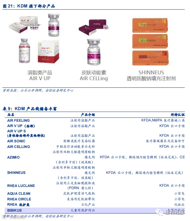 根据公开调研,KDMedical2016年成立于韩国首尔,是一家专注于医疗美容用医疗器械制造销售,医疗美容用活性原料开发与研究的科技型公司。该公司在轻医美类产品的布局丰富,涵盖溶脂注射产品、皮肤改善型动能素、高周波治疗仪装置、注射用透明质酸钠、皮肤清洁仪等,已有多款产品获KFDA、CE、NMMP等国家质量体系认证,销售范围覆盖中国、美国、日本、俄罗斯、阿联酋和澳大利亚等十余个国家。KDM轻医美类产品线囊括总计四大类中的所有类目,细分领域的7个品种。其溶脂产品、射频类仪器、水光针、PDRN婴儿针、气泡型皮肤清洁仪和美容用按摩仪,均为自主研发设计。同时KDM拥有透明质酸加工技术、多肽类的处理技术、氨基酸和维生素合成技术。