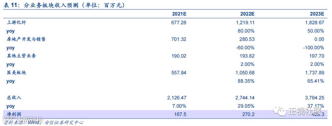 投资建议:买入-A投资评级。公司战略转型切入医美赛道,并购杭州连天美,通过下游医美机构快速切入医美产业链,而后通过与暨南大学医药生物中心、肌源科技合作布局上游产品耗材市场;并于年内持续推进地产板块系统性安排,未来将专注发展医美业务。地产板块进行剥离后(目前交易方式及交易价格仍有不确定性)该块业务对公司收入减少,未来公司收入主要由绿纤/医美贡献,其中绿纤一期4万吨项目21年正式投产,预计21年化纤/医美分别贡献收入为6.77亿元/5.58亿元。我们预计公司2021年-2023年的收入分别为21.26亿元/27.44亿元/37.64亿元,增速分别为7.0%、29。0%、37.2%,归母净利润分别为1.68亿元/2.70亿元/4.23亿元;给予买入-A 的投资评级。