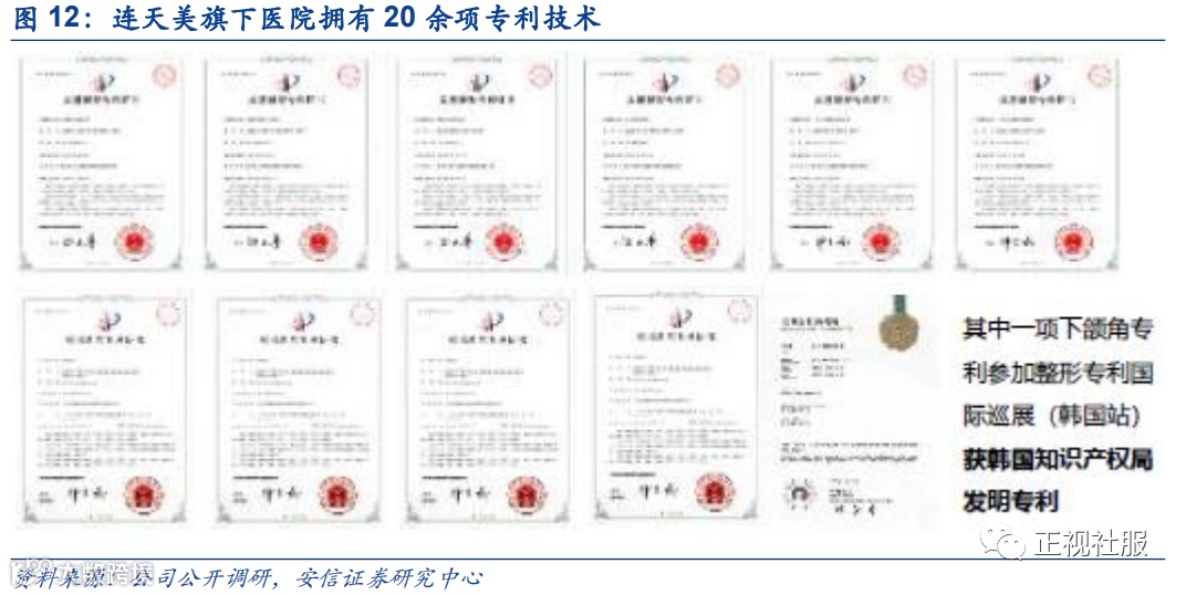 连天美旗下医院拥有20余项专利技术。其中针对鼻部整形专利7项,面颌部8项,胸部4项,以及牙科、塑性等其他专利。