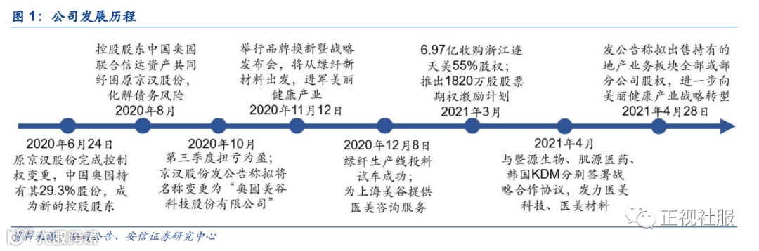 原名京汉股份,被奥园集团收购后快速步入医美产业。公司原名京汉股份,主营业务为房地产和化纤材料生产,2020年被中国奥园集团收购。6月24日控制权变更完成后中国奥园持有其29.3%的股份,成为新的控股股东,“京汉股份”也随后更名为“奥园美谷”,依托控股股东的产业资源和资金优势,高起点切入医美产业。奥园股份旗下拥有科技、健康、文旅、金融等多个产业板块,在医美、大健康等领域优势突出。公司有望依托集团各板块品牌和资源,加深在医美板块的布局。