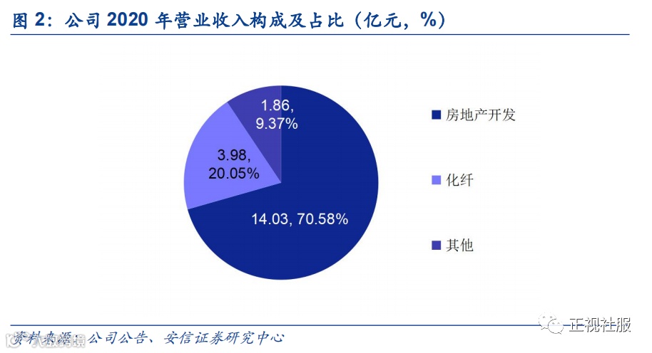 2020年公司主营业务为房地产开发及化纤材料生产。公司房地产业务以京津冀为中心打造多领域经营、多产业发展的综合性健康住宅业务链条,为公司2020年第一大营收来源,达 14.03亿元,占公司总营收的70.58%。以粘胶产品为主的化纤业务为公司第二大营收来源,2020年营收为3.98亿元,占公司总营业收入比例为20.05%。2020年公司其它业务营收为1.86亿元,占比9.37%。医美业务于2020年度尚未产生收入。2021年4月,公司发公告称拟出售持有的地产业务板块全部或部分公司股权,如地产业务板块全部置出,2021年度公司预计主要收入来源为化纤新材料业务和医美业务。