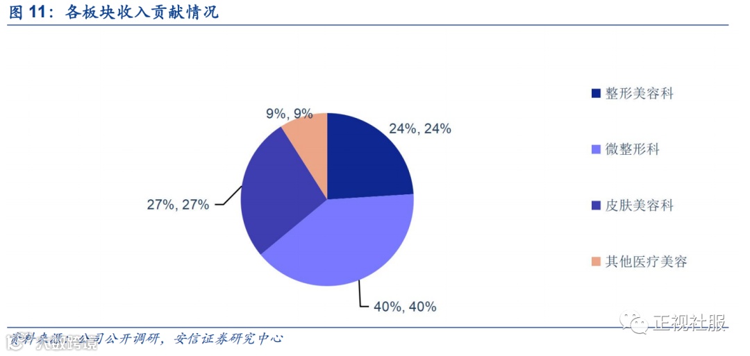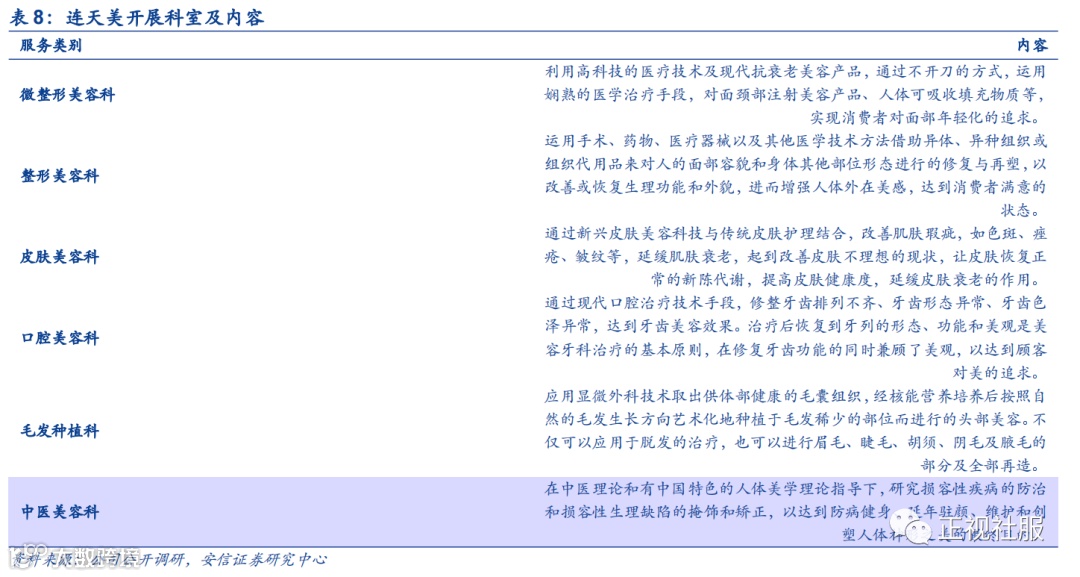 下属医院设有整形美容科、微整形科、皮肤美容科、口腔美容科等主要业务科室。为消费者提供整形、微整形、皮肤美容等服务。根据公司公开调研,连天美旗下医院收入来源约40%由微整形科贡献,而整形美容科与皮肤美容科各贡献24%及27%。