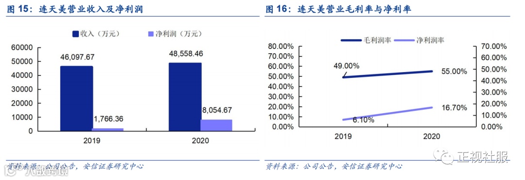 ■ 收购优质医美机构资产,专注发展医美主业。公司以6.97亿元现金收购连天美55%股权。连天美下属连天美、维多利亚两家医院,均为杭州老牌医美机构。连天美/维多利亚医院2020年收入坪效24,118元/28,335元,利润坪效4,023元/4,537元。2020年,连天美收入4.9亿,净利润9054.7万元,毛利率55.0%,净利率16.7%,竞争优势明显:①技术优势卓越:旗下医院拥有20余项专利技术,为中国整形美容协会首批认证的5A级医疗医美机构(2020年12月到期,资质暂获保留)、四级高难度手术资质医院;②医院医生团队实力雄厚:旗下医院共有医生58位,正高级5位,副高级8位以及16位特聘专家;③经过多年经营沉淀,凭借口碑获得广泛用户客群:旗下拥有超过30万名会员,年活跃用户8万。
