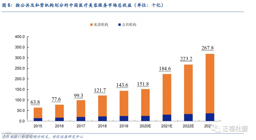 根据弗若斯特沙利文报告,2019年,民营机构收益占市场总收益的83.1%左右,达人民币1,193亿元,而2015年为人民币496亿元,2015年至2019年的复合年增长率为24.5%。受不断增长的医疗美容需求以及公共机构服务不胜负荷的推动,私营机构医疗美容服务市场收益到2024年预计将达到人民币2,815亿元。另一方面,近年来公共医疗美容服务市场增长相对缓慢。自2015年至2019年,公共机构的医疗美容服务市场规模从人民币142亿元增至人民币243亿元,复合年增长率为14.4%。截至2024年,预计公共医疗美容服务市场收益将达到人民币370亿元。