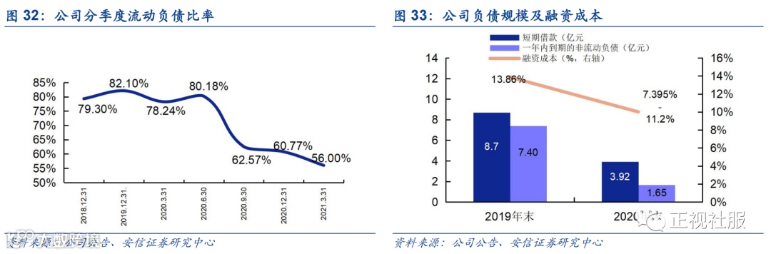 负债进一步优化,融资成本显著下降。2020年8月,中国奥园联合信达资产对公司进行债务重组,进一步化解债务风险、释放短债压力、解决流动性问题,帮助公司转入良性发展轨道。截至2020年末,公司短期借款为3.92亿元,同比-54.94%;一年内到期的非流动负债为1.65亿元,同比-77.70%;融资成本由2019年末的最高13.86%下降至2020年末的7.395%-11.2%。流动负债占总负债比率由2019年末82.10%下降至2020年末60.77%,2021Q1进一步下降至56.00%。公司流动性和短期债务情况显著改善。