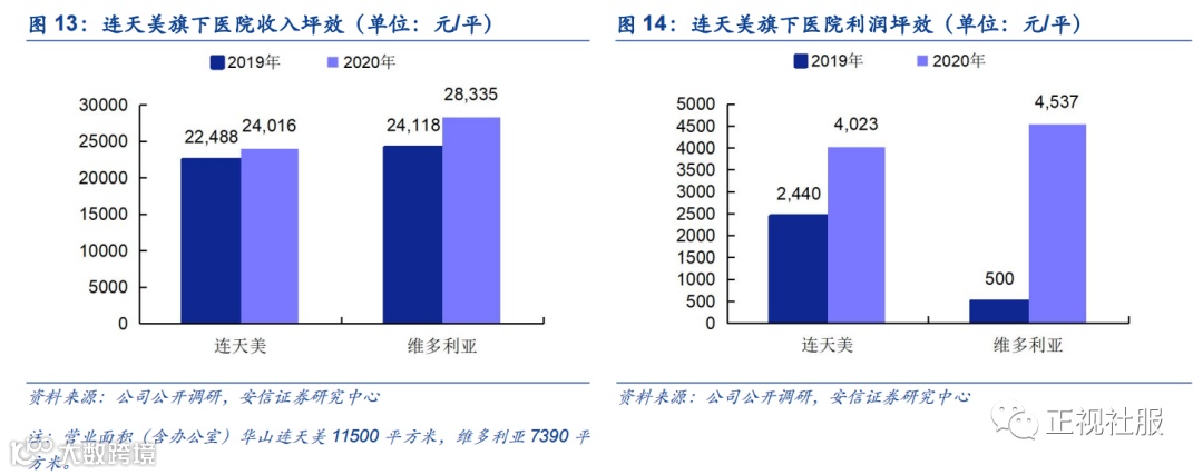 2019-2020年,连天美收入及利润坪效稳步提升。连天美医院收入坪效由2019年22,488元提升至2020年的24,118元,利润坪效由2019年2,440元提升至2020年的4,023元;维多利亚医院收入坪效由2019年24,118元提升至2020年的28,335元,利润坪效由2019年500元提升至2020年的4,537元。