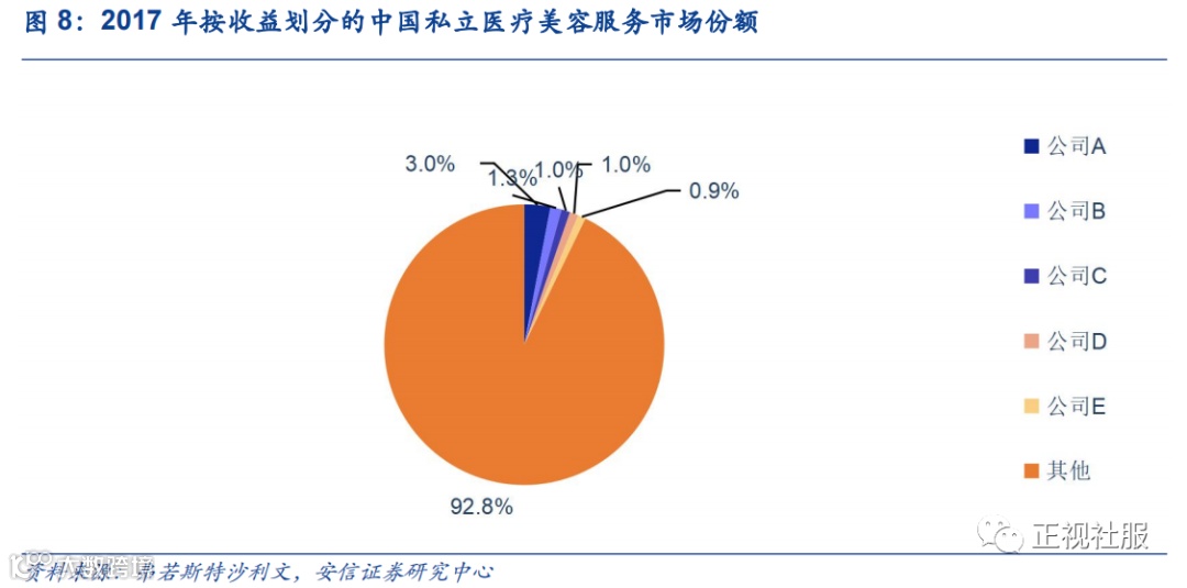 中国私立医疗美容服务市场极度分散,根据弗若斯特沙利文报告以2017年收益计,排名前5的市场参与者仅占总市场的7.2%。拥有技术优势、品牌实力及客户优势的医美集团正在通过设立新的医疗美容机构及收购现有优质医疗美容机构而迅速扩张。市场参整合无疑有利于促进行业更加成熟及提高医疗美容服务的整体质量。