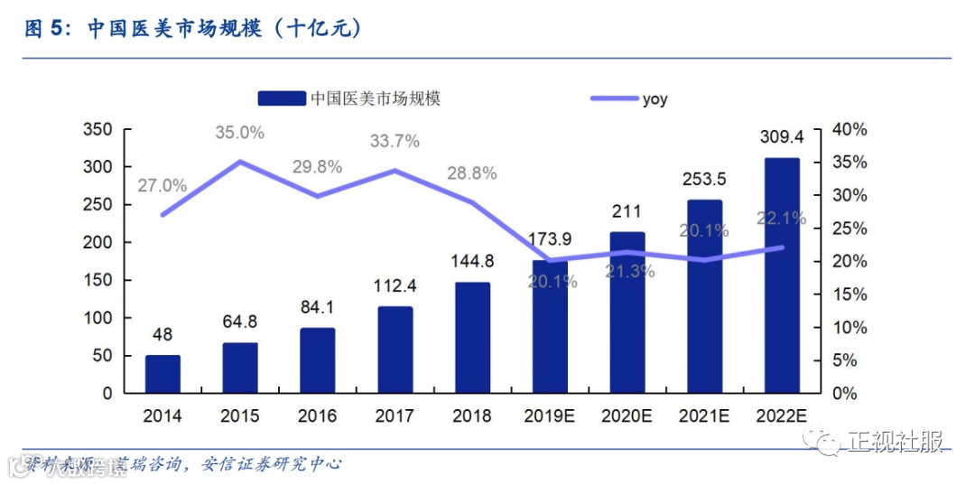我国医美行业起步较晚,但发展迅速,医美市场从以矫正治疗为主的单一市场逐渐发展成揽括医疗治疗及美容美观的多样化市场。根据艾瑞咨询数据,近五年行业规模快速增长,5年CAGR超30%,未来三年或进入行业调整期。近五年,中国医美市场快速增长,年增速保持30%上下,2018年市场规模达1448亿元,5年CAGR达31.79%。