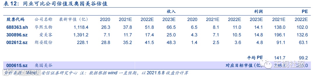 选取A 股相关公司华熙生物、爱美客及朗姿股份作为可比公司,参考可比上市2021年及2022年平均PE分别为141x及99x,给予奥园美谷2021年目标市值人民币238.1亿,对应股价为30.48元。