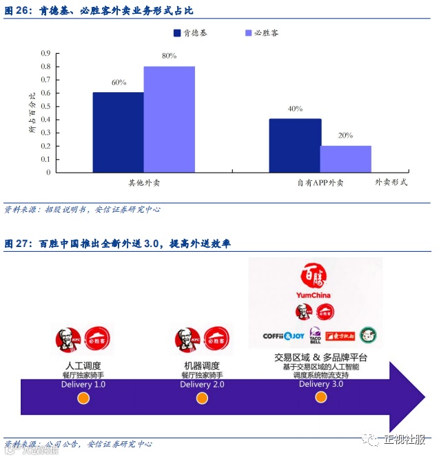 公司外送业务起步早,经过三阶段不断打磨在同类餐厅中具备先发优势。公司从2010年开始提供外卖服务,将外卖作为重要的业务增长驱动因素,经过多年发展具备一定先发优势:①自带流量提升外送量:一般而言,消费者更愿意选择品牌知名度高、食品安全有保障的餐饮品牌,同时百胜中国推出的付费会员提供外送费减免,自带2.65亿庞大会员数量为外送体系带来了流量。2019年,公司已成为中国外送销售额占比最高的连锁餐厅之一,同年外卖销售额占公司餐厅收入总额的21%。截至20H1,肯德基及必胜客分别约40%及20%的外卖订单及外送销售额来自他们的自有平台(包括移动及在线平台)。②外送体系升级提效:百胜中国的外送平台经历过三个阶段的打磨,从外送1.0的手动派单、完全自有配送,到外送2.0基于门店的自动化派单,再进化到目前的外送3.0阶段:基于业务区域支撑多品牌门店配送,基于AI的智能调度系统,并接入顺丰、饿了么、美团等第三方配送力量提供支持。在庞大体量的外送业务下,对外送体系的多次升级让百胜中国在保证外送服务高质量的同时,能够避免过高的配送成本。