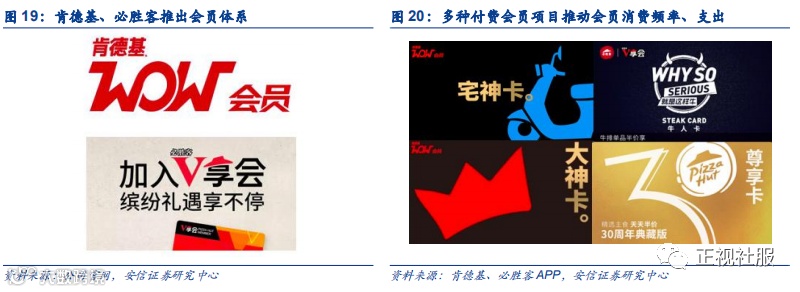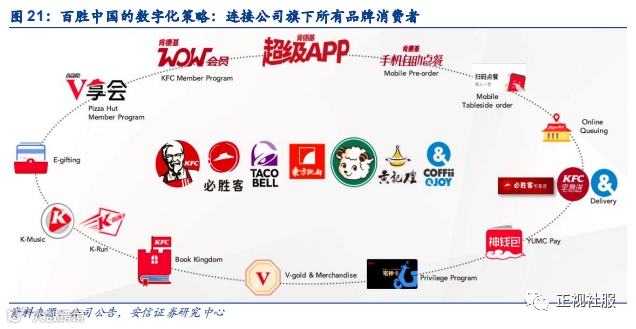 以超级APP为核心打造会员权益体系平台能够有效提升客流量、客单价。围绕会员的全渠道连接和全场景服务,百胜中国建立了一个跨品牌的数字化生态系统。百胜中国的会员权益体系在不断演进:2016年,肯德基推出了“WOW会员”体系;2017年,必胜客推出“V享会”会员体系;2018年开始,陆续推出“宅神卡”、“牛人卡”、“大神卡”等付费会员项目。付费会员项目方面,2018年肯德基的自有平台的付费会员转化率为22%,在享有会员权益期间,会员用户的支出增长了1.1倍,消费频率增长1.4倍。付费会员项目的推出有效地提升了客流及客单价,为餐厅销售增长提供了有力支撑。同时公司以“超级APP”为抓手得以与用户建立起持续的连接和服务场景,承载一系列数字化运营营销,赋予公司运营效率新活力。