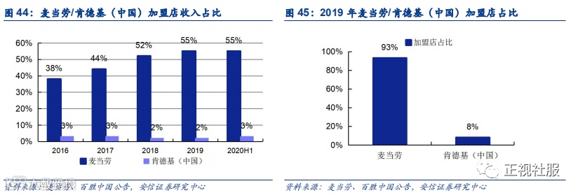 直营vs加盟:目前肯德基(中国)门店以直营为主,未来或将加码加盟展店。相较于麦当劳门店经营模式,肯德基(中国)更加偏爱直营模式,2020H1麦当加盟店收入占55%,而同期肯德基(中国)仅3%;在加盟店占总门店数量比例上,麦当劳高达93%,而肯德基(中国)也仅有8%,双方在经营门店上有着巨大差距。直营模式有维护品牌名誉、易于管理等优势,但是在展店时需要更多的资金支持。麦当劳曾在2016年3月发布声明、设定长期目标,将旗下95%的连锁餐厅改用特许经营模式(被特许发展商自行进行店铺选址,直接向业主支付租金,并承担开新餐厅所需要的所有费用),肯德基后续展店若加大加盟模式比例或将降低展店成本并提升展店速度。