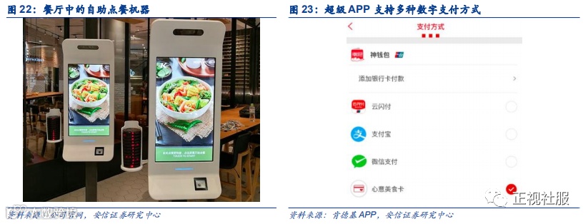 出众的数字化点餐及支付技术为餐厅降本提效,提升公司整体盈利能力。公司大力发展数字化点餐系统,用户可以通过手机APP进行堂食和外卖的自助线上点餐和预订,截至2020H1,97%的支付通过数字化形式完成,主要包括移动应用程序及外卖平台。从点餐自然延伸到支付环节,超级APP提供包括支付宝、微信支付以及“神钱包”等数字化支付方式,进一步提升便利性和效率。同时,2017年公司与支付宝合作,在全球率先商业化使用人脸识别支付技术,根据招股书,截至2020H1已在中国约1000家肯德基餐厅应用刷脸支付。数字点餐及支付技术可以优化餐厅人员配置并减少点餐及现金管理的相关成本,有助于提升公司整体的盈利能力。